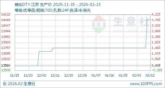 2月13日,生意社錦綸DTY基準(zhǔn)價(jià)為14080.00元/噸,與本月初(13760.00元/噸)相比,上漲了2.33%。